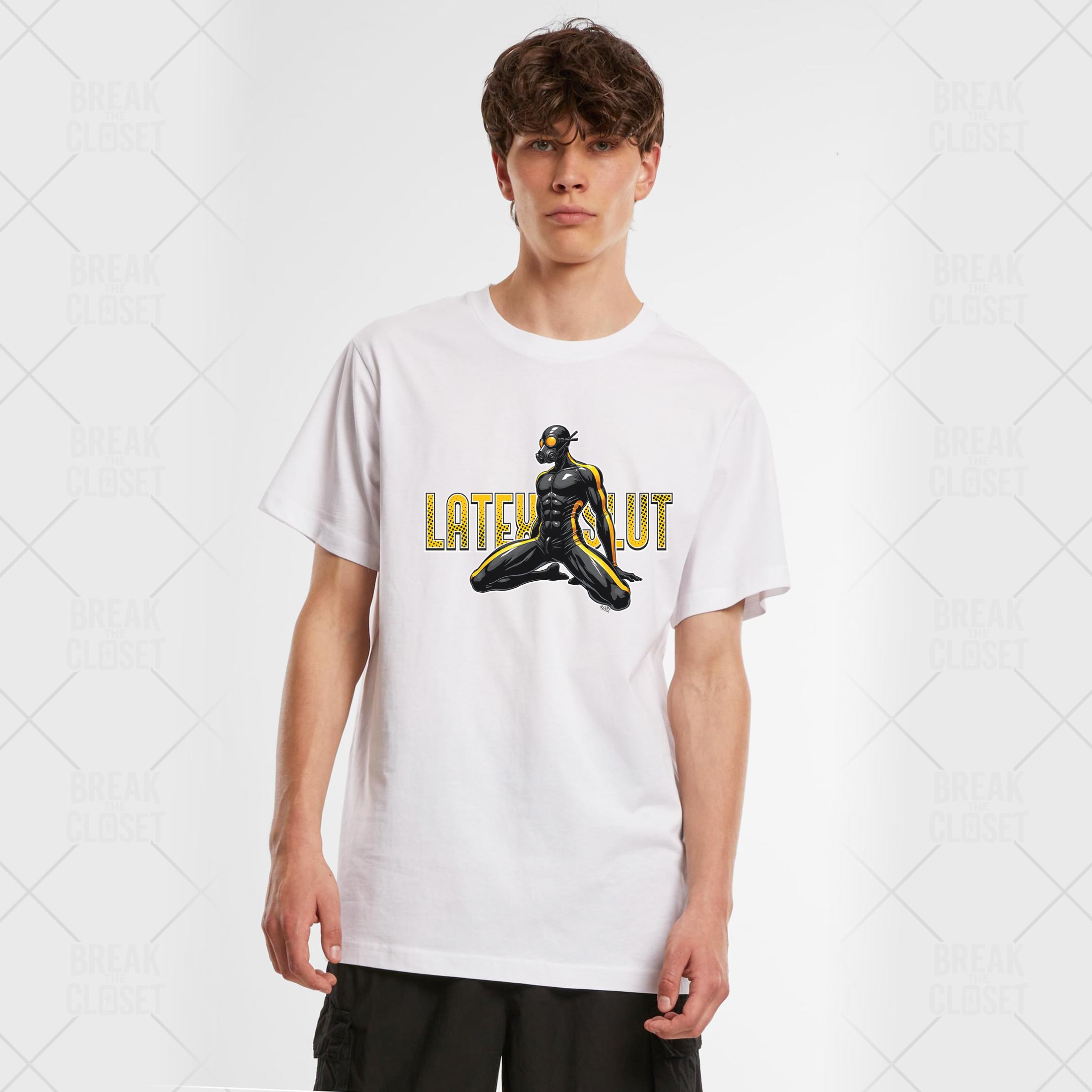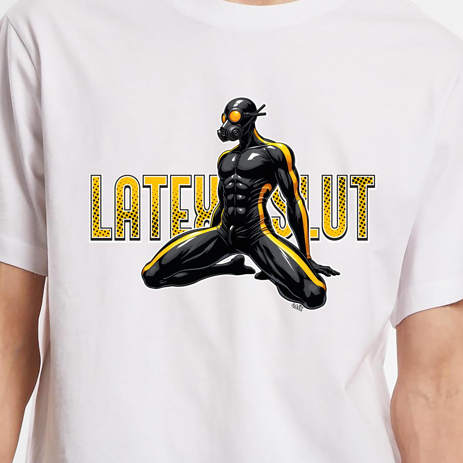 Le visuel met en avant un personnage en tenue intégrale de latex noir et masque à gaz, accompagné du slogan audacieux Latex Slut. Ce design puissant célèbre la culture fetish, latex et kink, tout en restant stylisé et graphique.