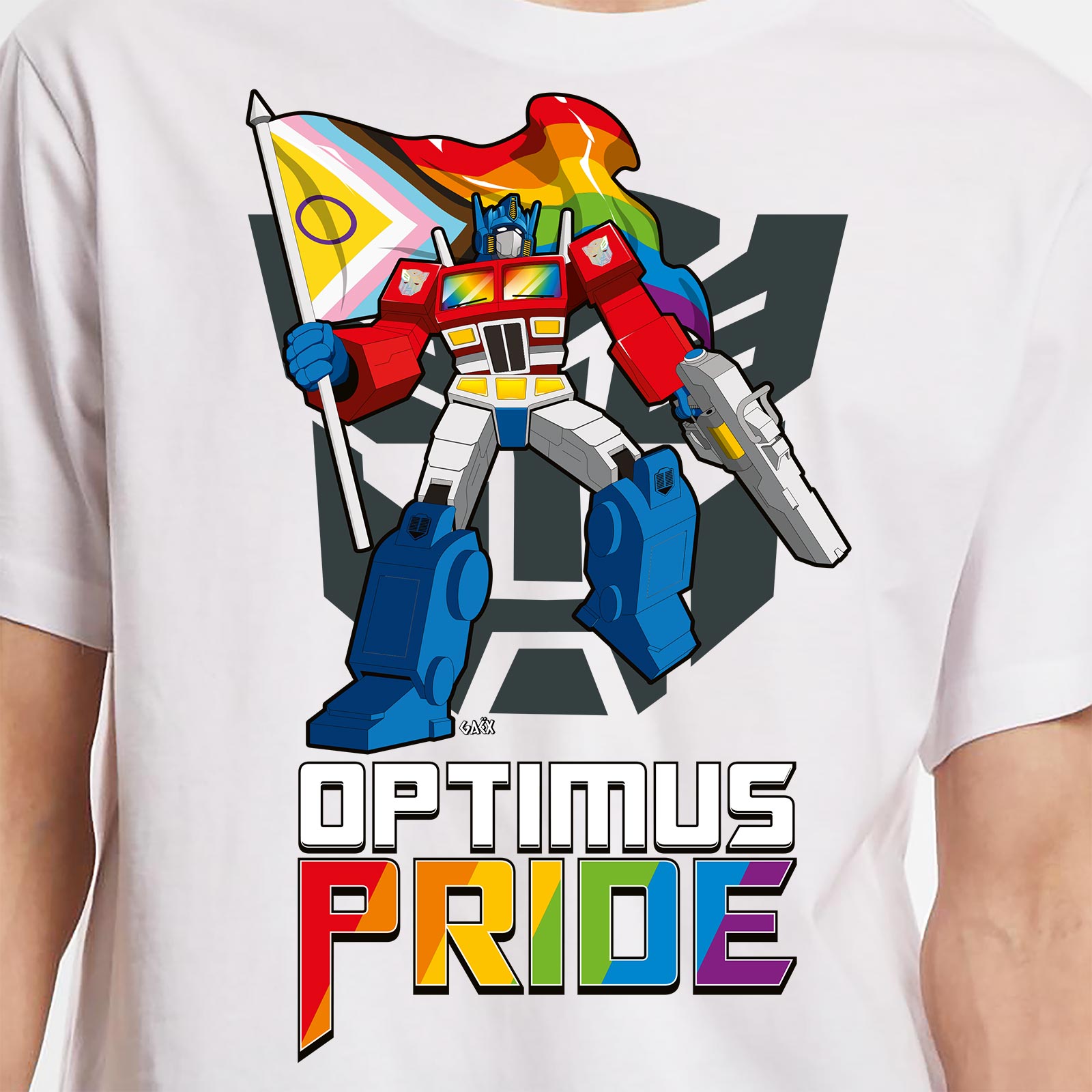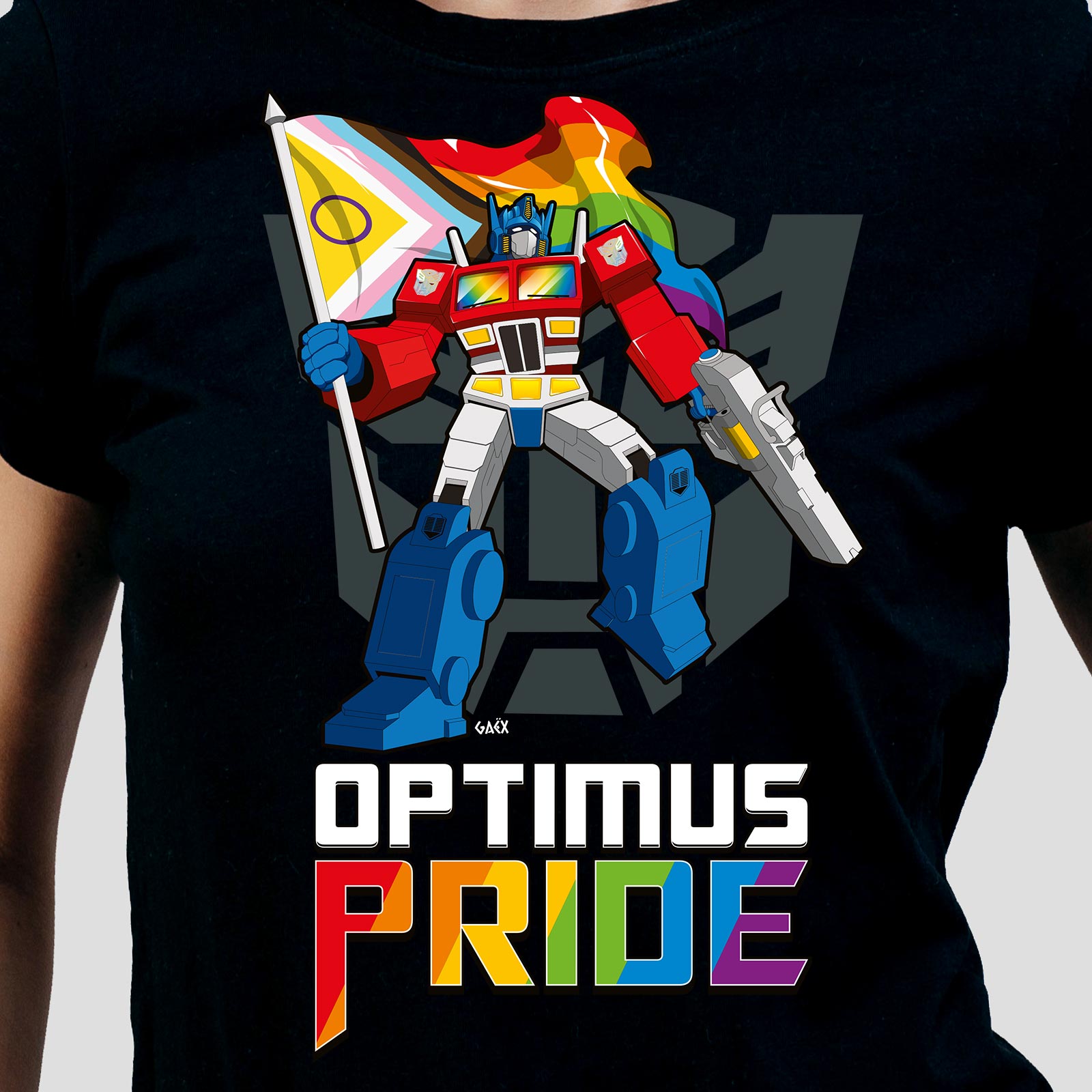Le design met en scène un robot guerrier iconique brandissant un drapeau arc-en-ciel progress flag, avec le slogan revisité Optimus Pride. Un visuel fun et inclusif qui détourne la pop culture pour célébrer la diversité, la tolérance et l’humour geek.