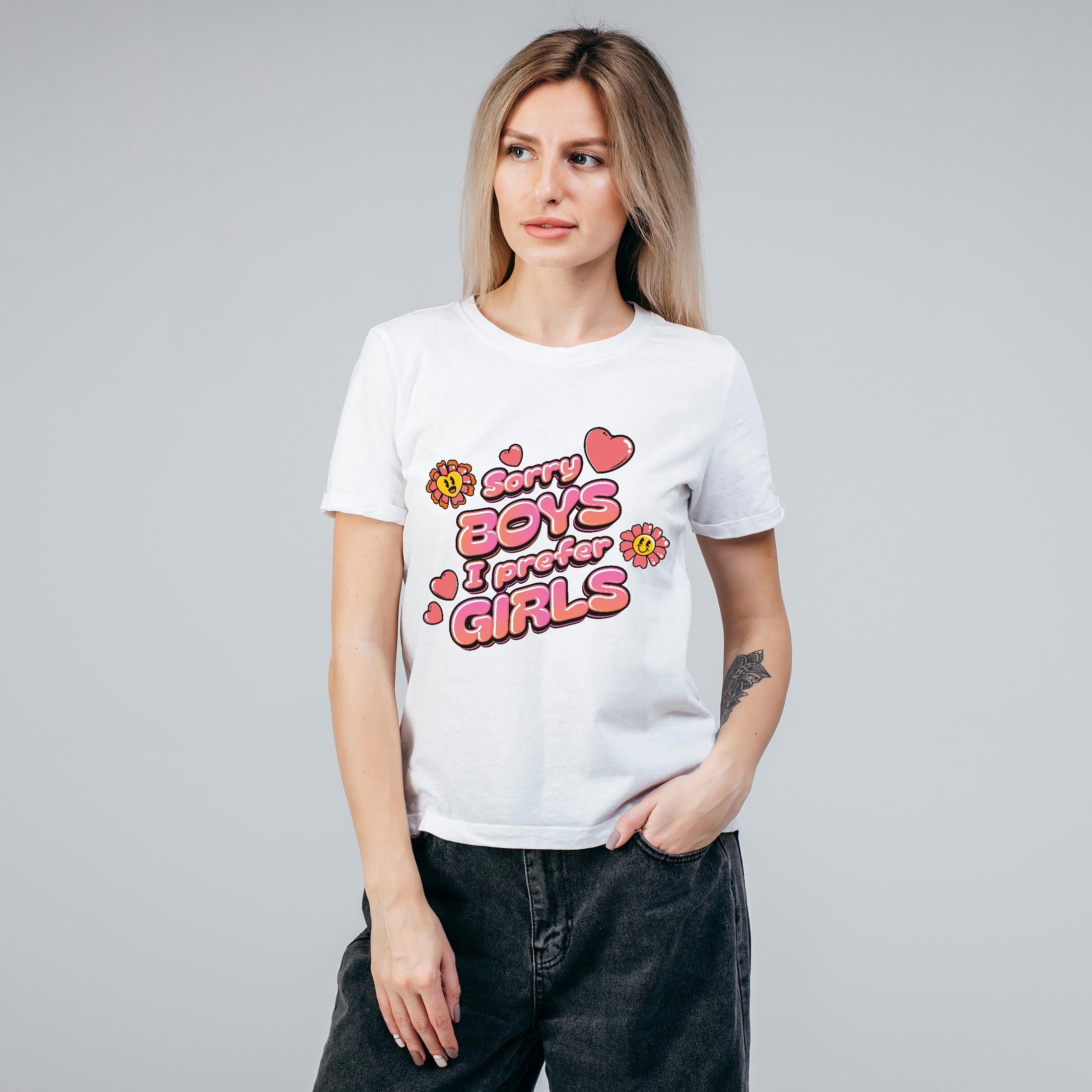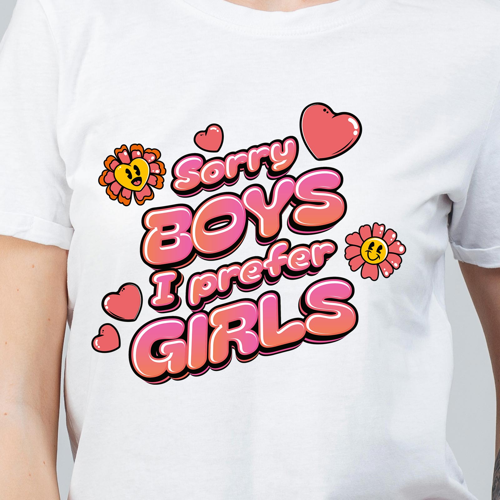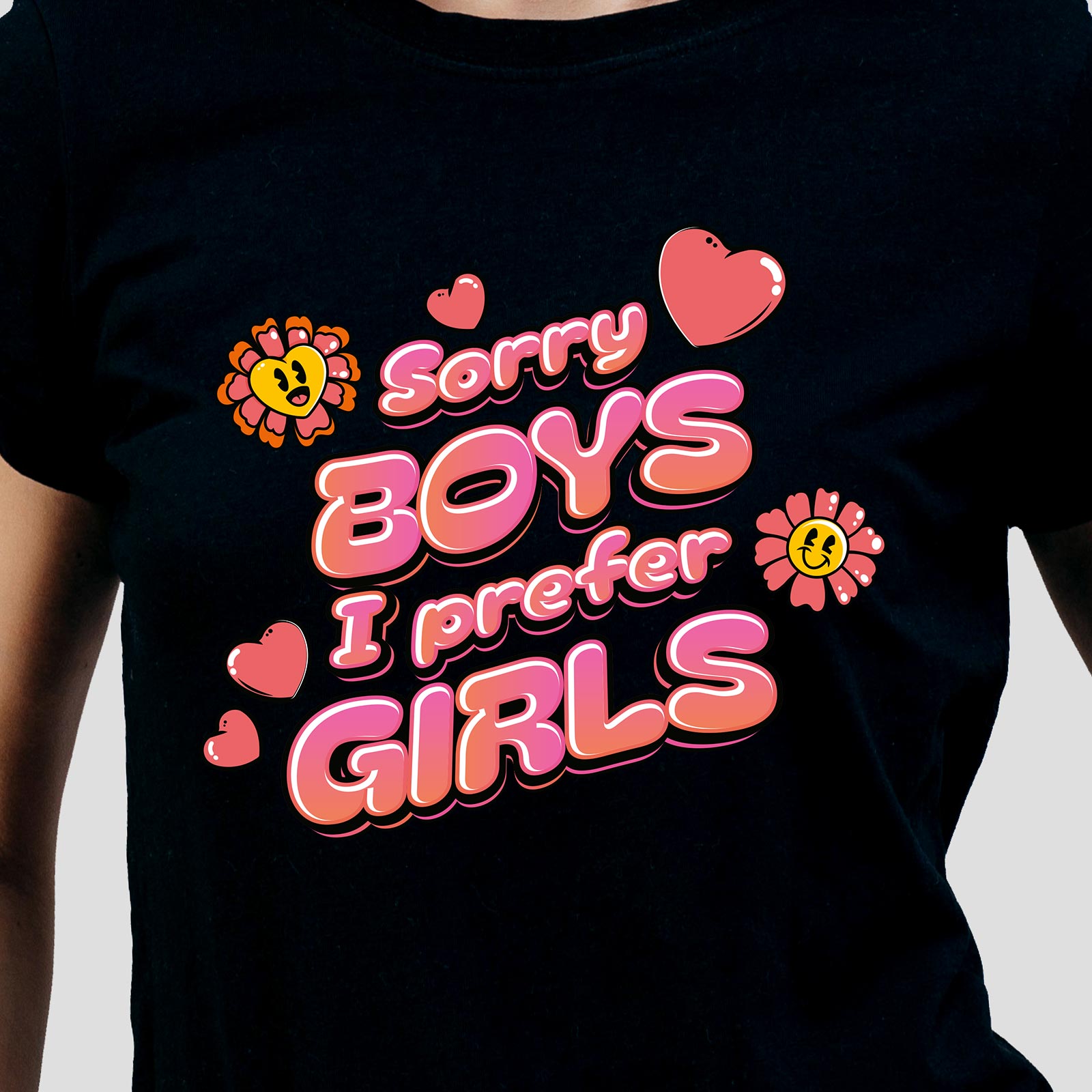 Le design joue sur un look rĂ©tro pop avec un lettrage rose entourĂ© de cĆurs et de petites fleurs, accompagnĂ© du slogan Sorry Boys I Prefer Girls. Un message clair et affirmĂ© qui cĂ©lĂšbre la fiertĂ© lesbienne et queer tout en gardant une touche fun et colorĂ©e.