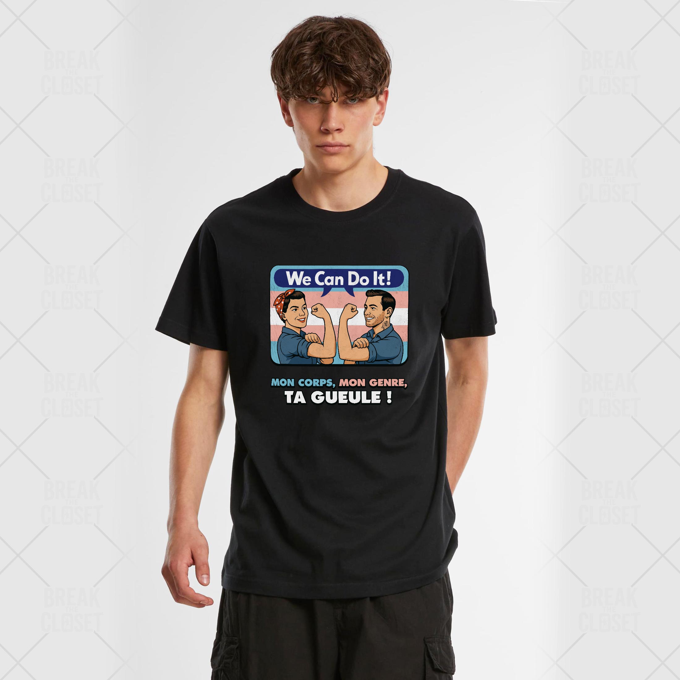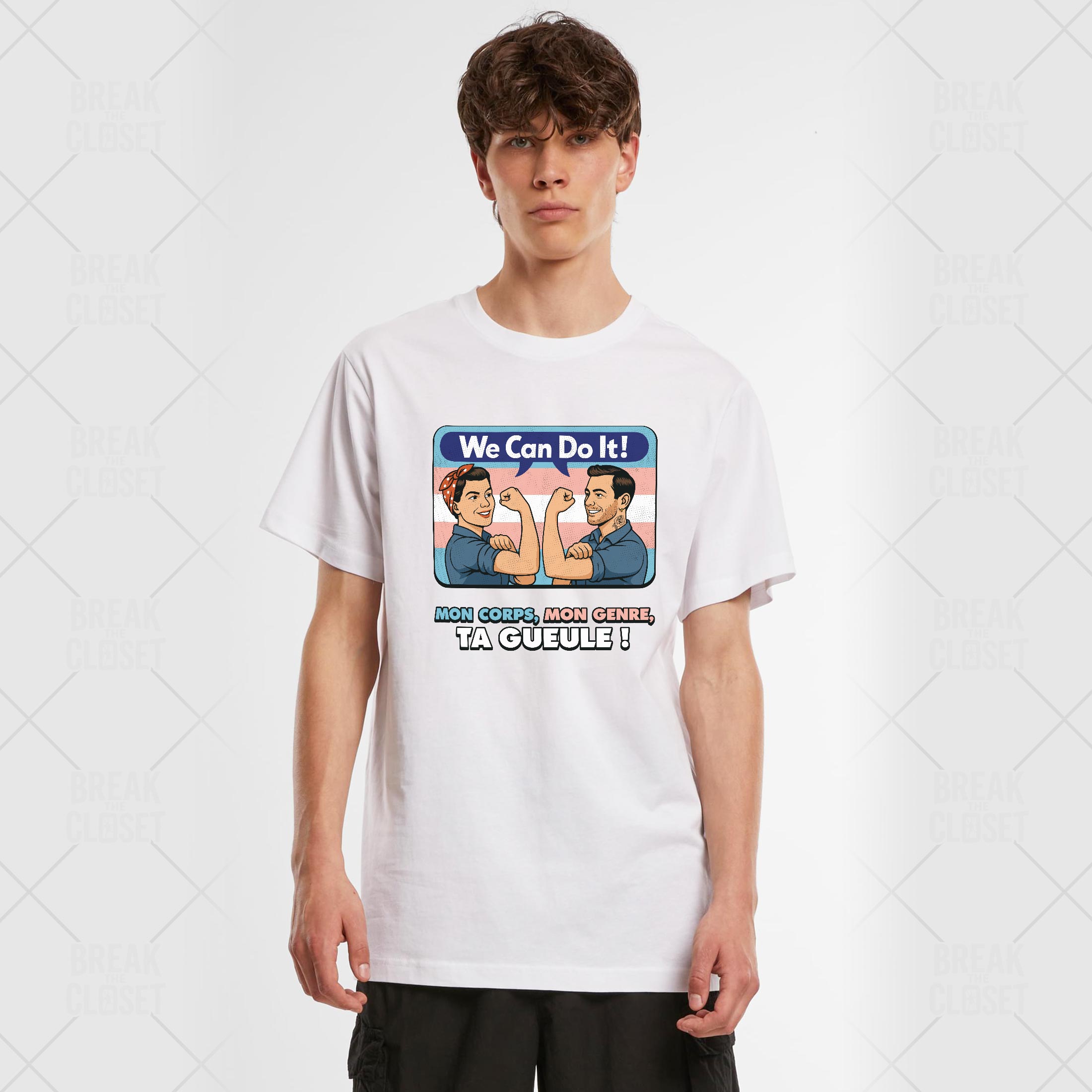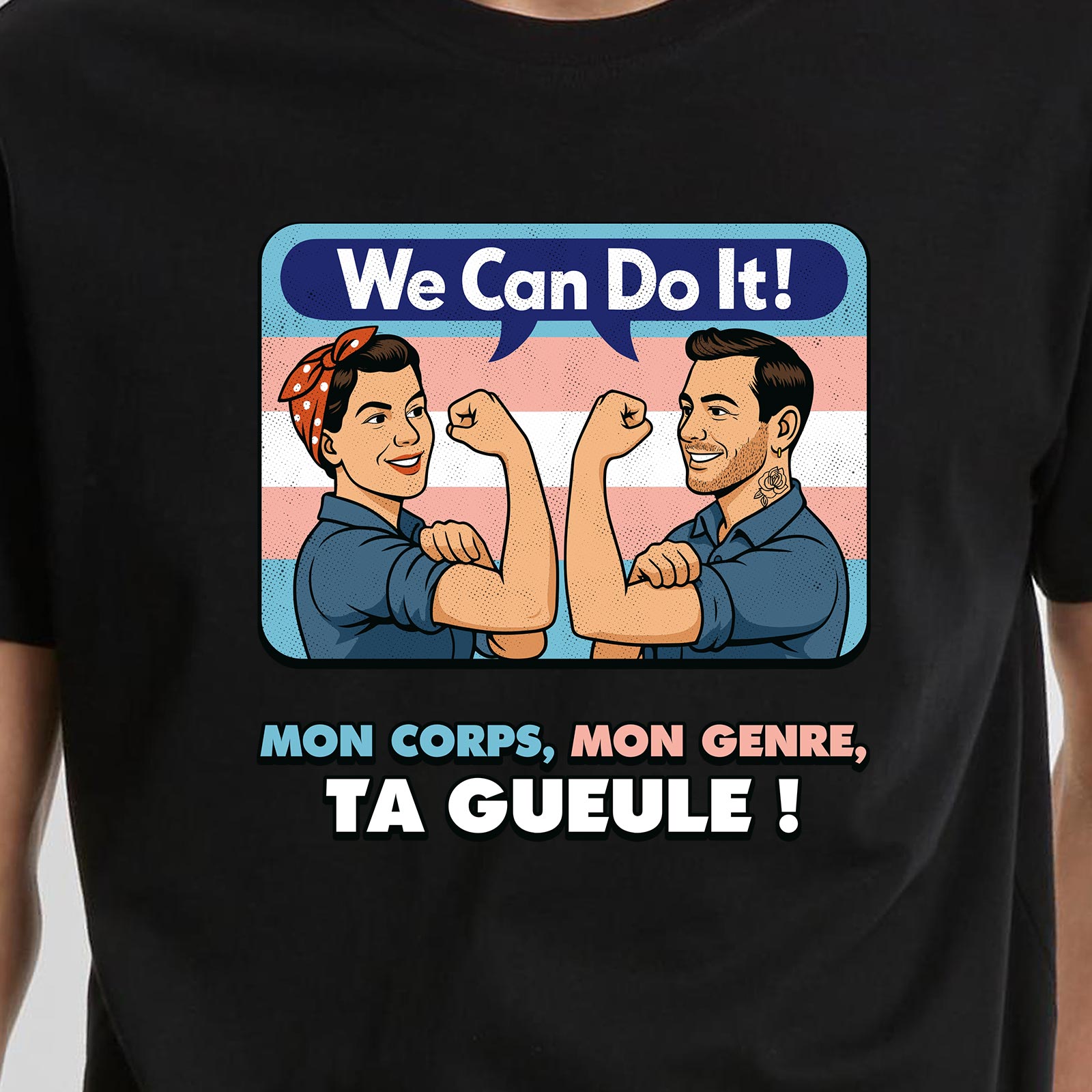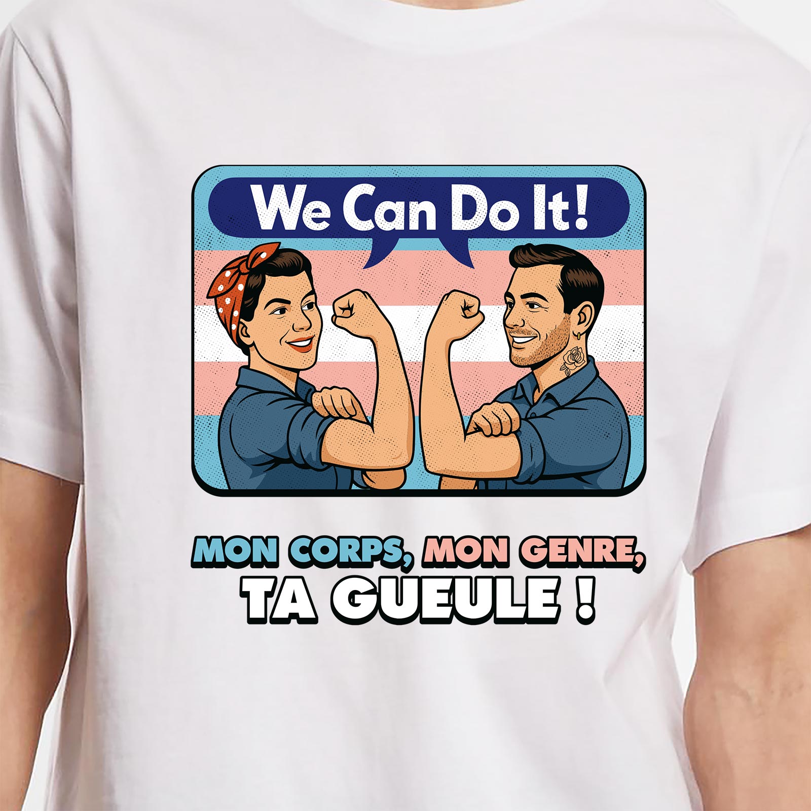 Le design reprend lâiconique affiche fĂ©ministe We Can Do It! revisitĂ©e dans une version inclusive et trans. Deux personnages musclĂ©s affichent leur dĂ©termination devant un fond aux couleurs du drapeau trans, accompagnĂ©s du slogan fort et sans dĂ©tour : Mon corps, mon genre, ta gueule !. Un visuel qui revendique lâautodĂ©termination, la fiertĂ© trans et la lutte pour lâĂ©galitĂ©.