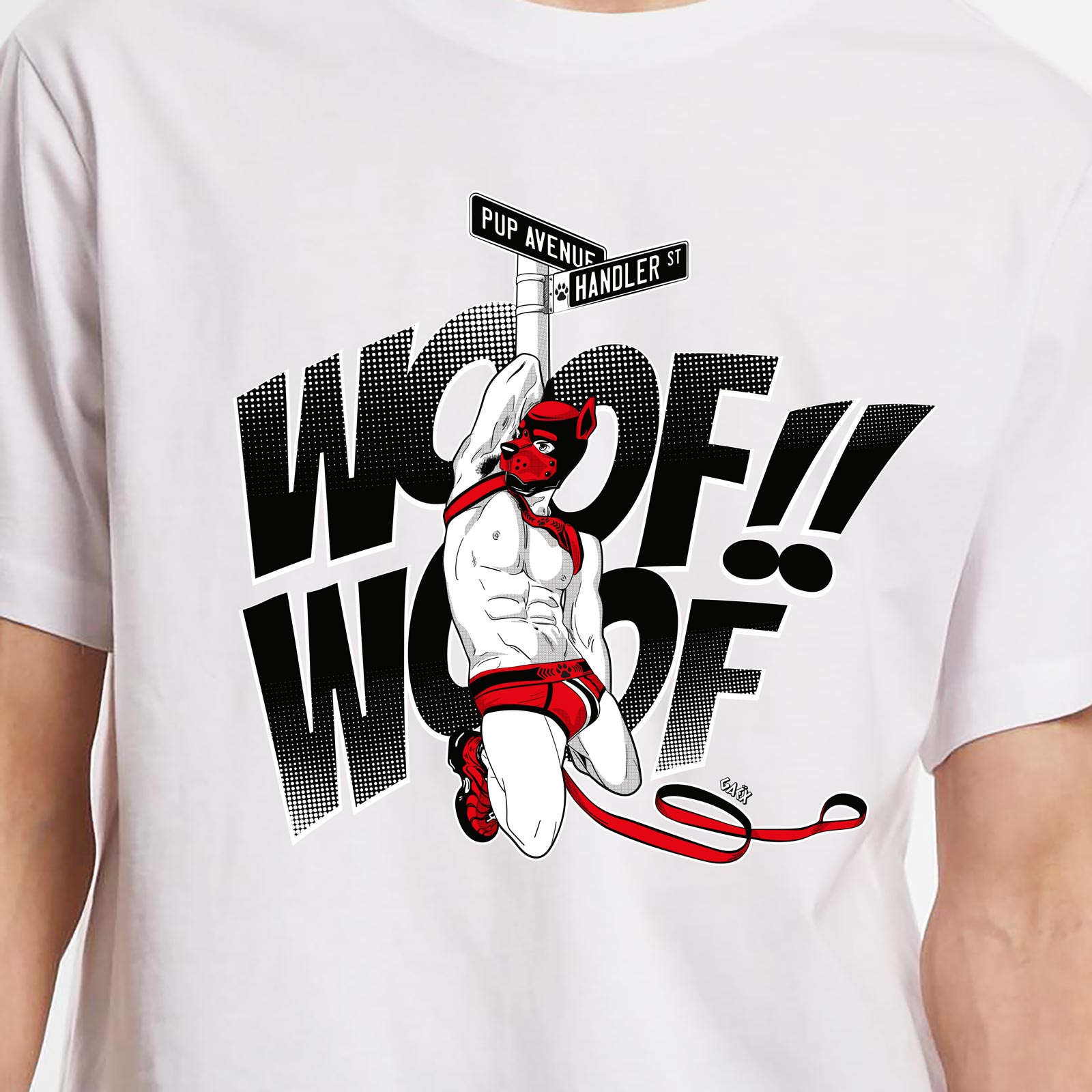Son visuel percutant met en avant un personnage en masque puppy, agenouillé avec laisse et harnais, accompagné du slogan explosif Woof!! Woof!!. Un design fun et provocateur qui rend hommage à la communauté puppy play, entre fierté, complicité et esprit festif.